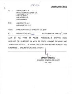 उत्तर प्रदेश के डीजीपी  राजीव कृष्णा ने आने वाले दिनों में पड़ने वाले त्योहारों को देखते हुए सभी जिलों को अलर्ट रहने के साथ-साथ पुलिसकर्मियों को विशेष परिस्थितियों में ही छुट्टी मिलने के निर्देश दिए हैं. उन्होंने पुलिस कर्मियों की छुट्टियों पर 16 अक्टूबर से 28 अक्टूबर तक रोक लगा दी है. इस दौरान विशेष परिस्थितियों में ही पुलिसकर्मियों को अवकाश मिल सकेगा.