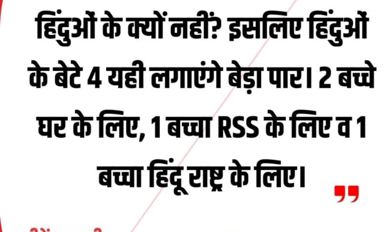इसलिए हिंदुओं के बेटे 4 बच्चे जरूर करें – 2 बच्चे घर के लिए, 1 बच्चा स्वयं सेवक संघ (RSS) के लिए, और 1 बच्चा हिंदू राष्ट्र के लिए। यही “बेड़ा पार” लगाएंगे।