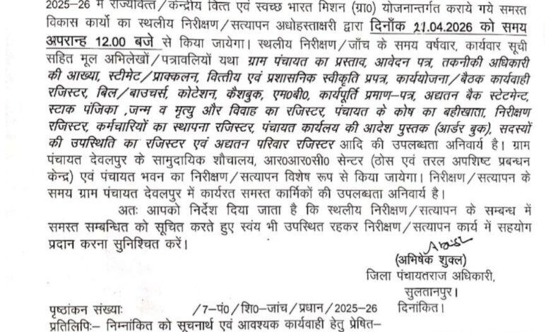 लम्भुआ (सुल्तानपुर): भ्रष्टाचार के खिलाफ जीरो टॉलरेंस का दावा करने वाला प्रशासनिक अमला खुद सवालों के घेरे में है। जनपद के विकासखंड लम्भुआ की ग्राम पंचायत देवलपुर में विकास कार्यों की जांच का मामला मंगलवार को तमाशा बनकर रह गया। जिला पंचायत राज अधिकारी (DPRO) ने खुद नोटिस जारी कर जांच की तारीख तय की थी, लेकिन वे खुद ही मौके से नदारद रहे।